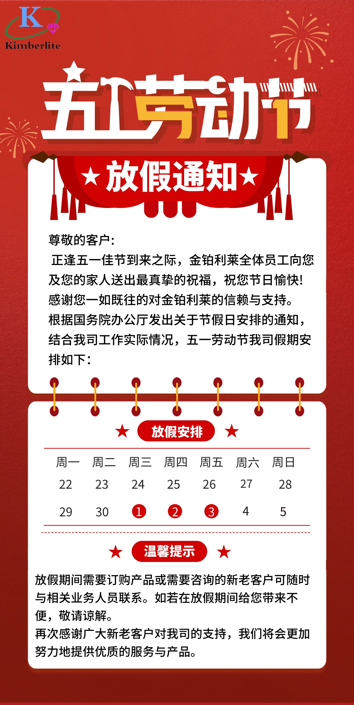 金鉑利萊2024五一勞動節(jié)放假通知。