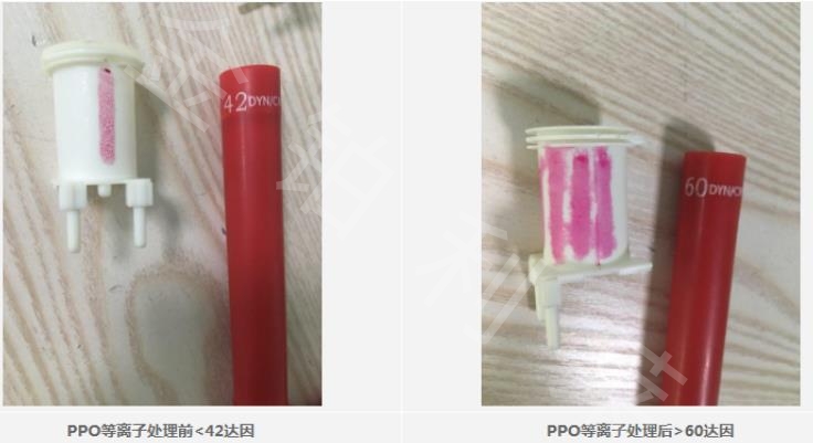 典型塑料材料:像PVC,PP,甚至還有PTFE等塑料,親水性往往很差,即使我們使用30的達(dá)因筆進(jìn)行表面測試,劃在這些材料表面,墨跡立馬聚集在了一起,像這樣的效果如果是直接做粘接、或者印刷,是肯定會出現(xiàn)質(zhì)量問題的。想要改善這鐘情況,就需要提升塑料產(chǎn)品表面的達(dá)因值,其中最為簡單、環(huán)保的方法就是使用等離子清洗機(jī)處理表面,處理后達(dá)因值能達(dá)到60-70達(dá)因。